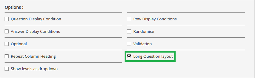 - To change long question layout, click on the option icon on the far right-hand side of the element you want to edit and Options with optional tick boxes will appear below