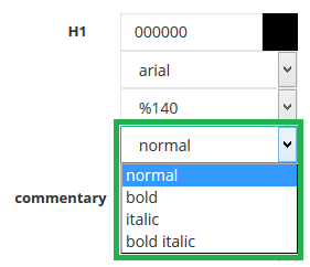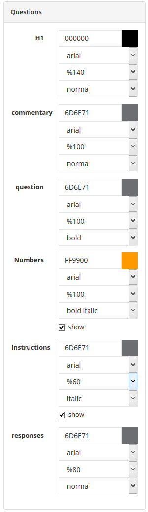 You can change the color, font family, size and formatting for the H1 heading, commentaries, questions, numbers, instructions and responses. You can also show/hide question numbers and instruction.