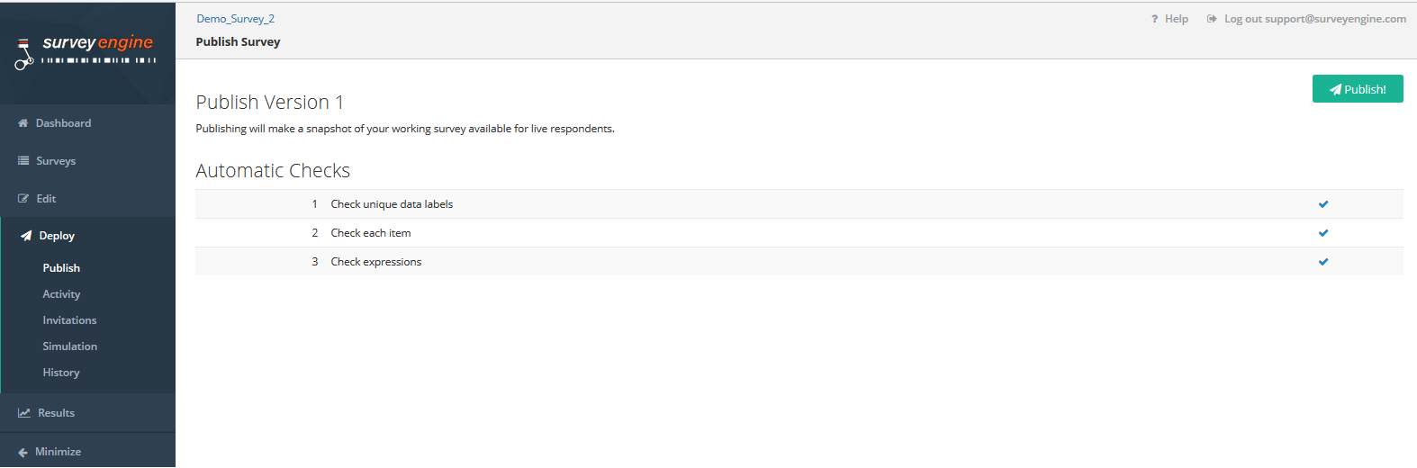 When your survey is finalized and you are ready to start collecting responses, you need to 'Publish' your survey. Once your survey is published you are able to invite respondents to complete the survey and start collecting results.