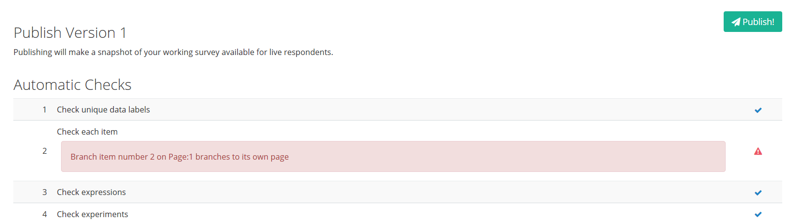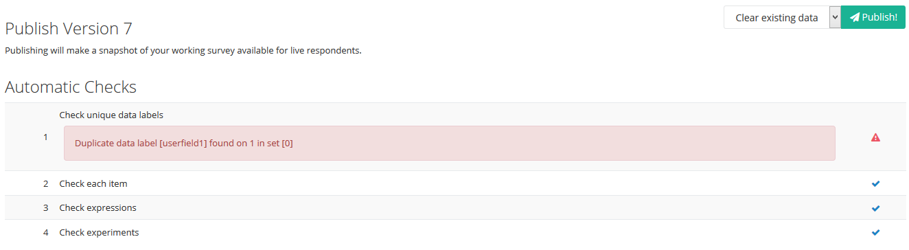 → Note: These tests are designed to find obvious flaws, such as duplicate data labels, looping branches or bad expressions. If all checks have a tick next to them, indicating they have passed the tests, the survey is OK to proceed to Live status.