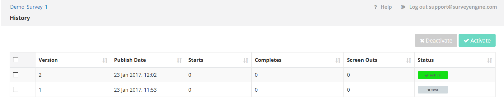 - In the History tab you can see the new version of your survey have now the status “active”, previous versions the status “test”. For more information see Deploy > History.