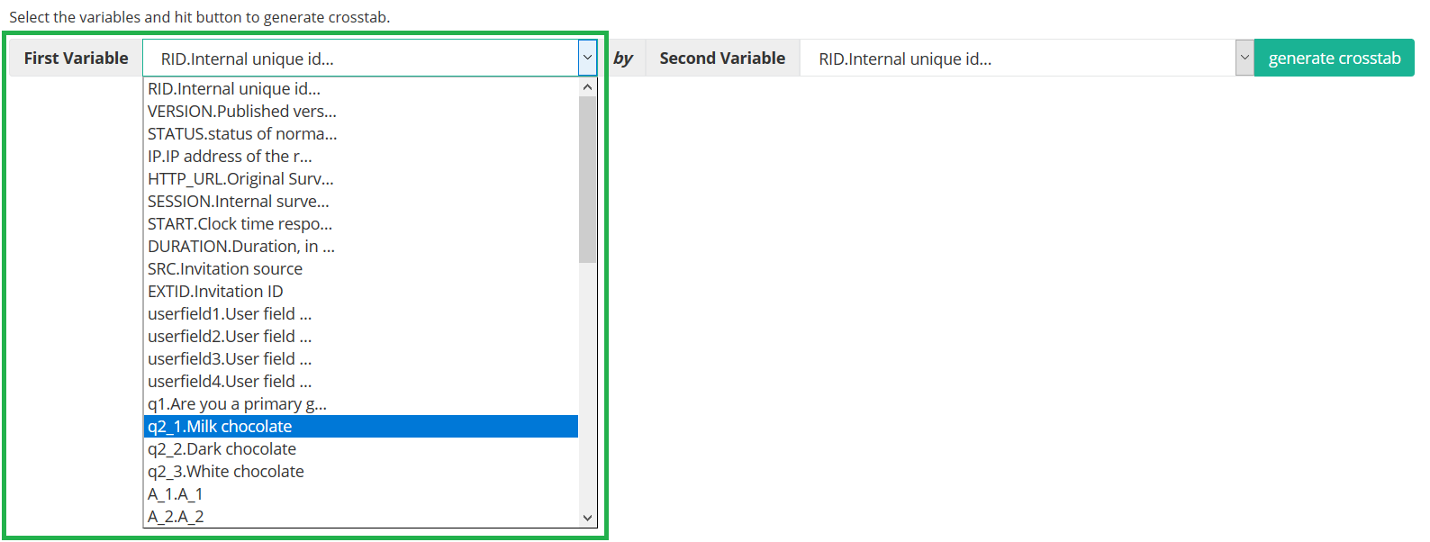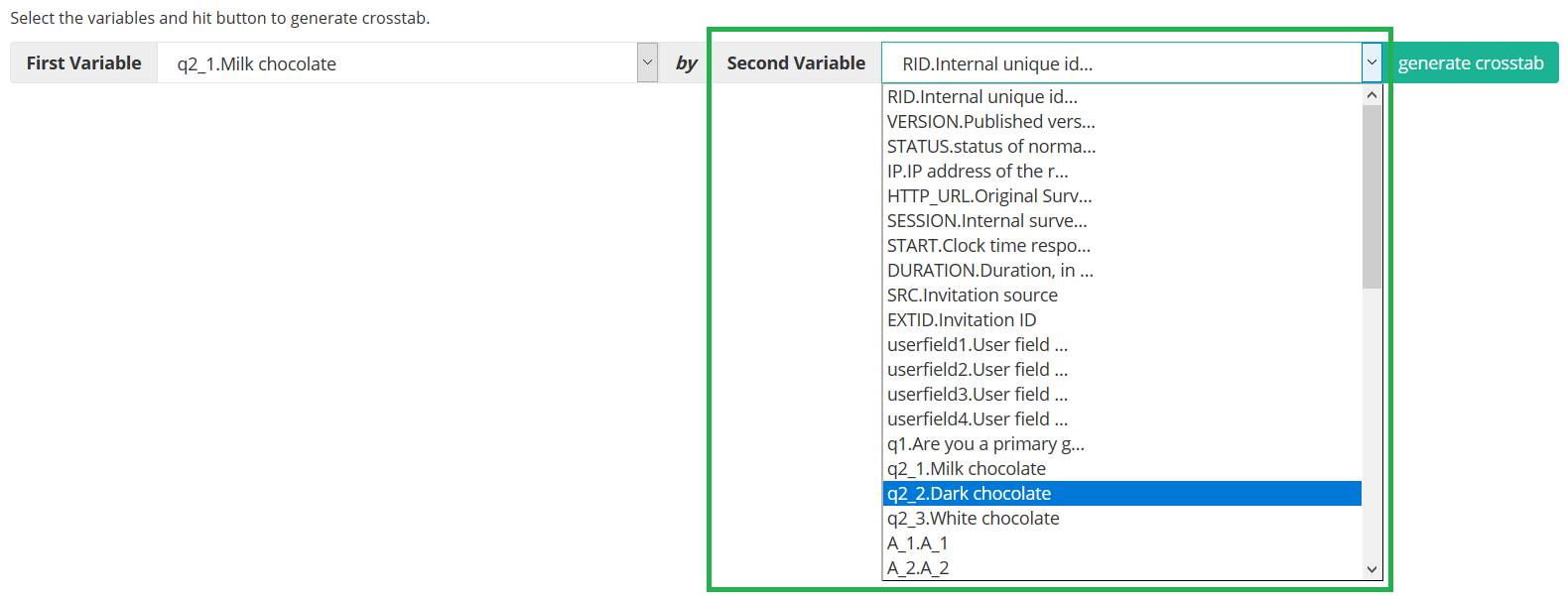 - Select in the dropdown next to "Second Variable" the second variable. The values of this variable will form the rows of the crosstab
