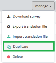 want to duplicate and choose ‘Duplicate’ from the drop down menu - In the pop-up window type in the name of your new survey and click [Create duplicate]