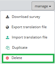 - Click [manage] next to the survey you want to delete and choose ‘Delete’ from the drop down menu